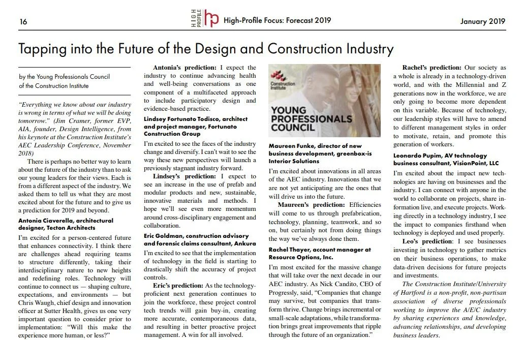 Lindsey Fortunato was recently interviewed by the Construction Instuitute for High Profile regarding the future of the construction industry, and trends anticipated in 2019.